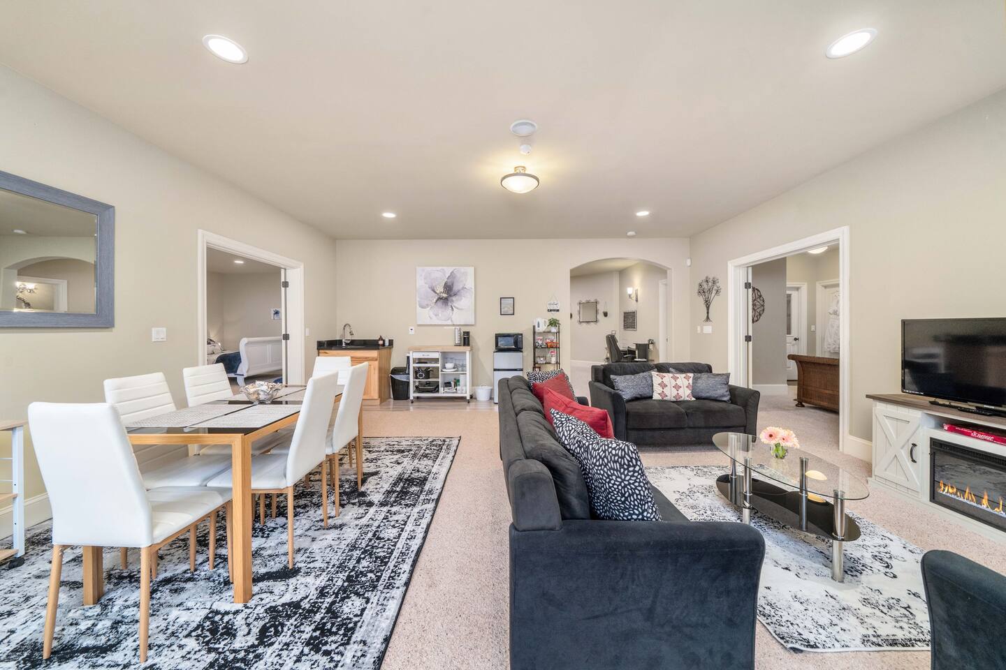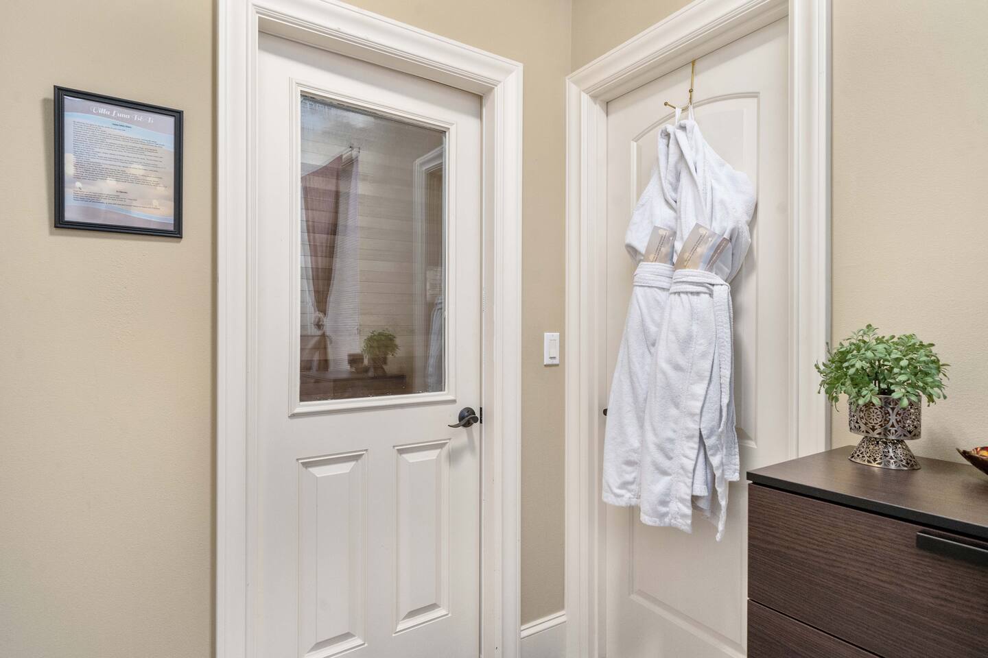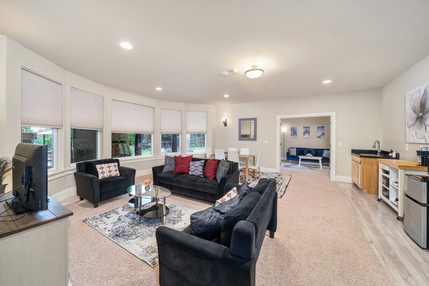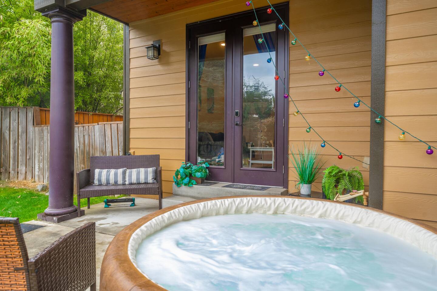 Whether you're seeking a tranquil escape or an adventure-packed holiday, the Villa Luna is your perfect haven. You'll enjoy the entire 1,200 sq. ft. ground floor apartment in our 3-story Mediterranean Villa, we reside on the 2nd and 3rd floors. This is not just any getaway—it’s a couples' paradise or the ultimate launchpad for your adventurous group outings. The central location offers easy access to some of the Pacific Northwest's most stunning natural attractions. Spend your days hiking through lush forests, exploring the vibrant culture of nearby cities, or unwinding at local beaches. After a day of adventure, return to the comfort and luxury of your apartment, where a soothing soak in the outdoor spa tub or a quiet evening by the fire pit awaits. Afterwards let the Indoor Sauna work its magic on your muscles! The Villa features plush furnishings throughout, inviting you to unwind in luxury. Each morning, you can enjoy a leisurely breakfast at the cozy dining area or take your coffee out to the landscaped yard, where nature's beauty surrounds you, a birdwatcher's paradise! If you prefer to stay in for dinner, simply order from Uber Eats and enjoy the snacks provided! The fireplace creates a cozy atmosphere while you login to watch your favorite shows and movies on the Roku TV. Bringing friends or family? The Villa comfortably hosts up to 6 guests! Our "Blue" bedroom features a chic velvet sofa that transforms into a double bed. Plus, we’ve got a self-inflating Queen-size air mattress with a USB charger for extra convenience. Families with little ones will appreciate the Pack-n-Play and high chair at the ready. Both bedrooms boast solid wood sleigh beds, fluffy spa robes, and luxurious bedding, along with a private patio for those peaceful morning coffees. Need to stay connected? Enjoy lightning-fast, free Wi-Fi and a handy work center complete with a printer. The attached laundry room is well-stocked, perfect for longer stays. Culinary enthusiasts will love our outdoor BBQ for those summer cookouts (small cleaning fee applies), while the indoor kitchenette stands ready with a spacious dorm fridge, coffee pot for your morning fix, electric tea kettle, microwave, hotplate, and an air fryer. We’ve got all the dishes and utensils you need—just note that we don’t have an oven. Gather around the dining table that seats six for memorable meals together. Guests have full access to our 1/2 acre landscaped yard, featuring multi-level entertainment decks, and breathtaking views of Puget Sound, Mt. Rainier, Commencement Bay, Point Defiance, and the islands. Don't forget to head up to the balcony level for the perfect photo opportunity! Arriving late? No problem! Our keyless entry system provides 24/7 access. We value your privacy but are just a message away if you need anything. Here at Villa Luna, we pride ourselves on providing an exceptional guest experience, with thoughtful touches throughout your stay, every detail is designed to make you feel at home. Everyone deserves a luxurious spa getaway, so treat yourself to a stay at the Villa Luna today!